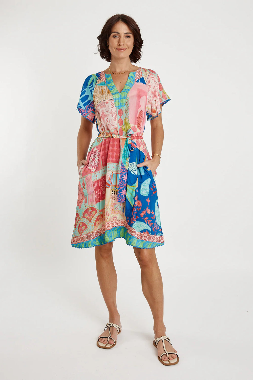 Bright, breezy, and effortlessly feminine, the LulaSoul Taj Dress is designed for easy comfort with a vibrant touch. Made from soft 100% viscose modal, it drapes beautifully with a lightweight feel that’s perfect for warm weather. The relaxed A-line shape offers a flattering silhouette, while the V-neck features subtle stitching detail for a clean, polished finish. Loose raglan sleeves add ease of movement, and ricrac braid on the sleeves and hem brings a playful, textural accent. With practical side pockets and an optional waist tie for added shape, this knee-length dress—finished in an exclusive digital print and designed in Australia—strikes the perfect balance between colour, comfort, and contemporary style.