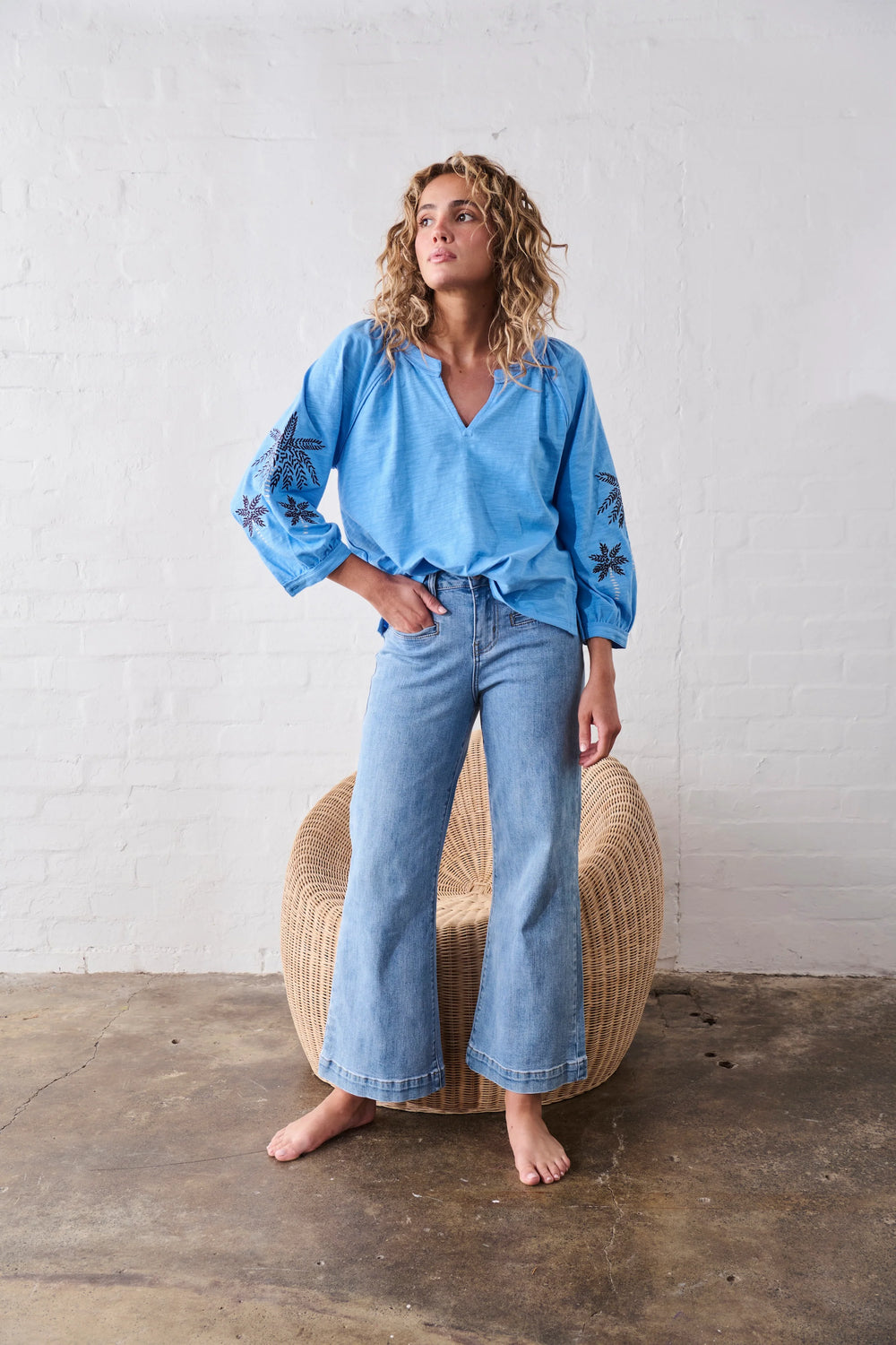 Channel chic 70’s style. A modern twist on the classic wide-legged jean, the Freya Jean features a mid/high rise that’s fitted at the hips with a relaxed, wide leg that flares at the knee. Works so well with one of our classic cotton tees and a pair of boots or sandals.