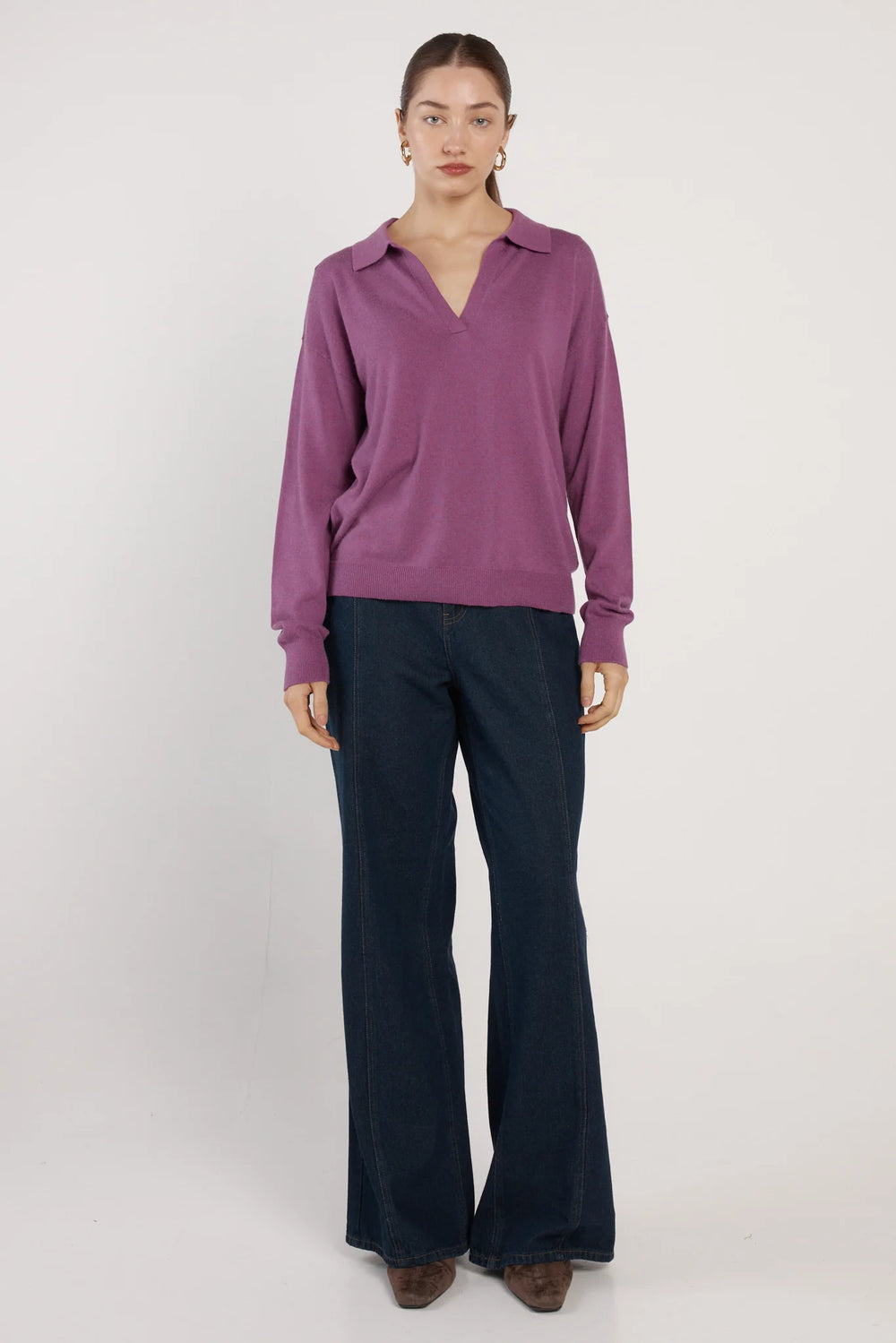 The Solenne Polo Knit refines everyday knitwear with understated polish. Its open collar and subtle V-front neckline create a clean, modern silhouette. Ribbed trims enhance its structured finish. A sophisticated trans-seasonal essential designed for effortless styling.