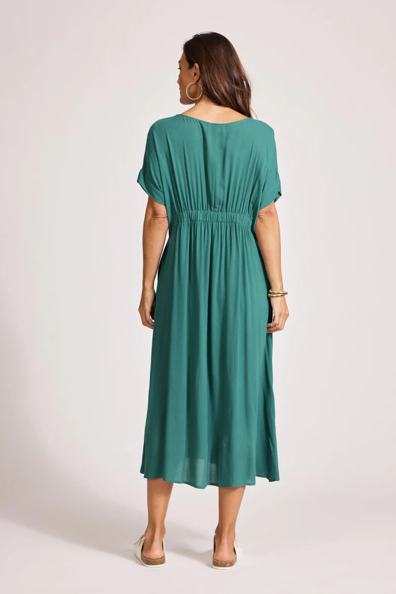 A light, easy-wear style perfect for summer. Features a round neckline, elastic detail at the waist and back, and functional pockets. Crafted from soft, flowing fabric with a relaxed fit that falls to mid-calf.