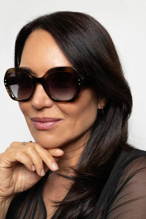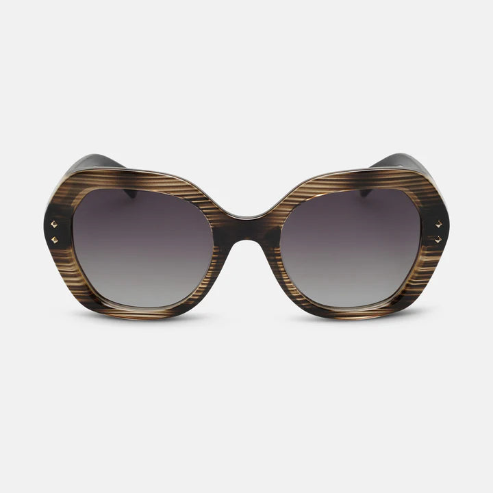 Kamilla, reimagined in cool grey geo stripes and deep olive arms, is made for the days when subtle just won’t do. Her rounded silhouette adds softness, while the pattern gives a nod to the bold. With polarised smoke lenses offering 100% UV protection, she’s ready for lazy mornings at the markets or spontaneous weekend escapes. Kamilla blends structure with soul and is perfectly balanced, effortlessly you.
