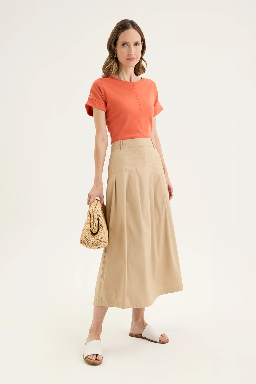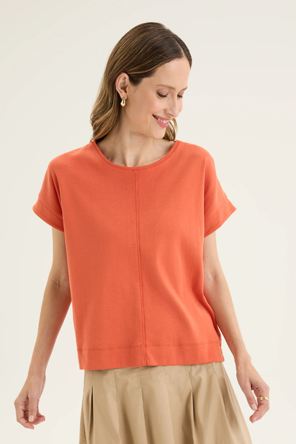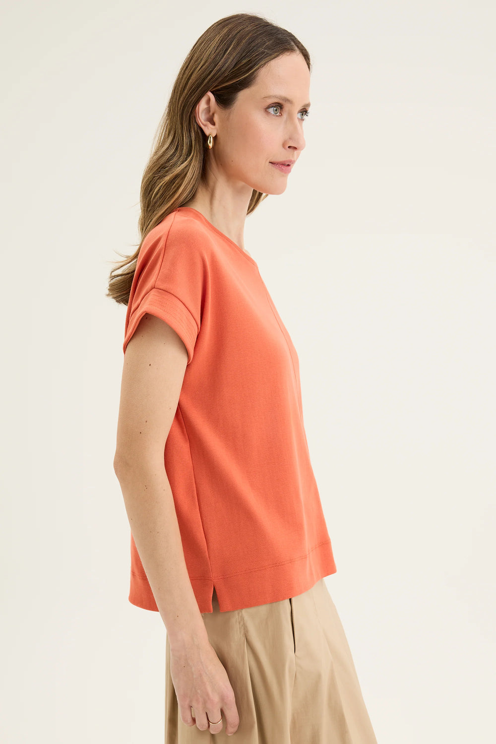 The Solitude Tee is a refined take on the everyday cotton t-shirt, crafted with Yarra Trail’s signature attention to detail. Made from 100% cotton, it features a soft round neckline, topstitched cap sleeves that fall just past the shoulders, and a centre front seam that subtly elongates the silhouette. The wide hem with side splits adds a thoughtful finish, creating an easy shape that sits comfortably on the body. With shorter sleeves than most Yarra Trail styles, this is a versatile, high-quality tee that offers something a little different - perfect for layering or wearing on its own through the warmer months.