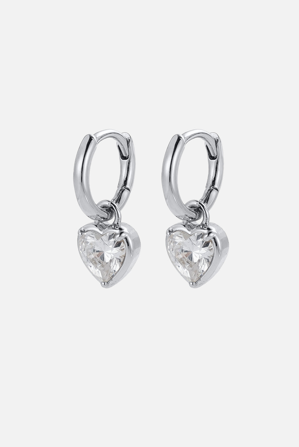 Dainty Silver hoop earrings featuring a heart-cut crystal drop. A subtle statement that adds shine and romance to any look.