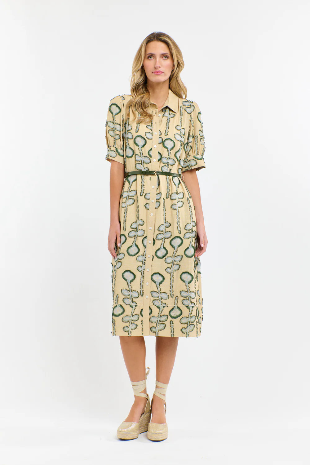 Feminine, comfortable and full of texture, the Eden Embroidered Dress brings easy polish to warm days. Raised embroidery adds depth across a soft viscose–linen base, while the button-through shirt shape keeps it stylish and simple to wear. Use the slim belt to define the waist or wear loose for a relaxed feel. Finish with espadrilles or a block heel for day-to-dinner ease.