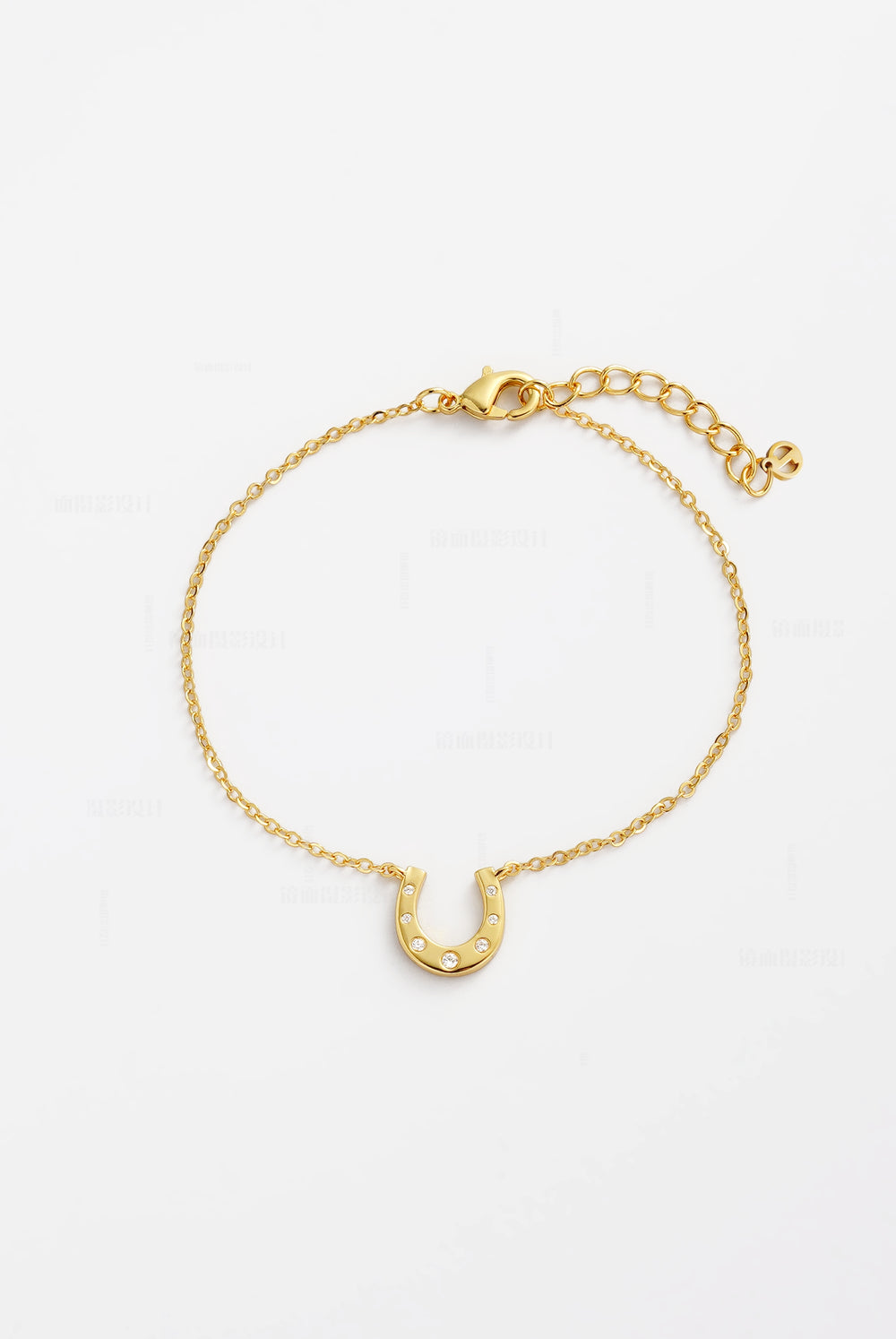 A fine gold chain bracelet finished with a horseshoe charm set with subtle stones—ideal for wearing alone as a delicate accent or layering with other bracelets for an effortlessly polished everyday look.