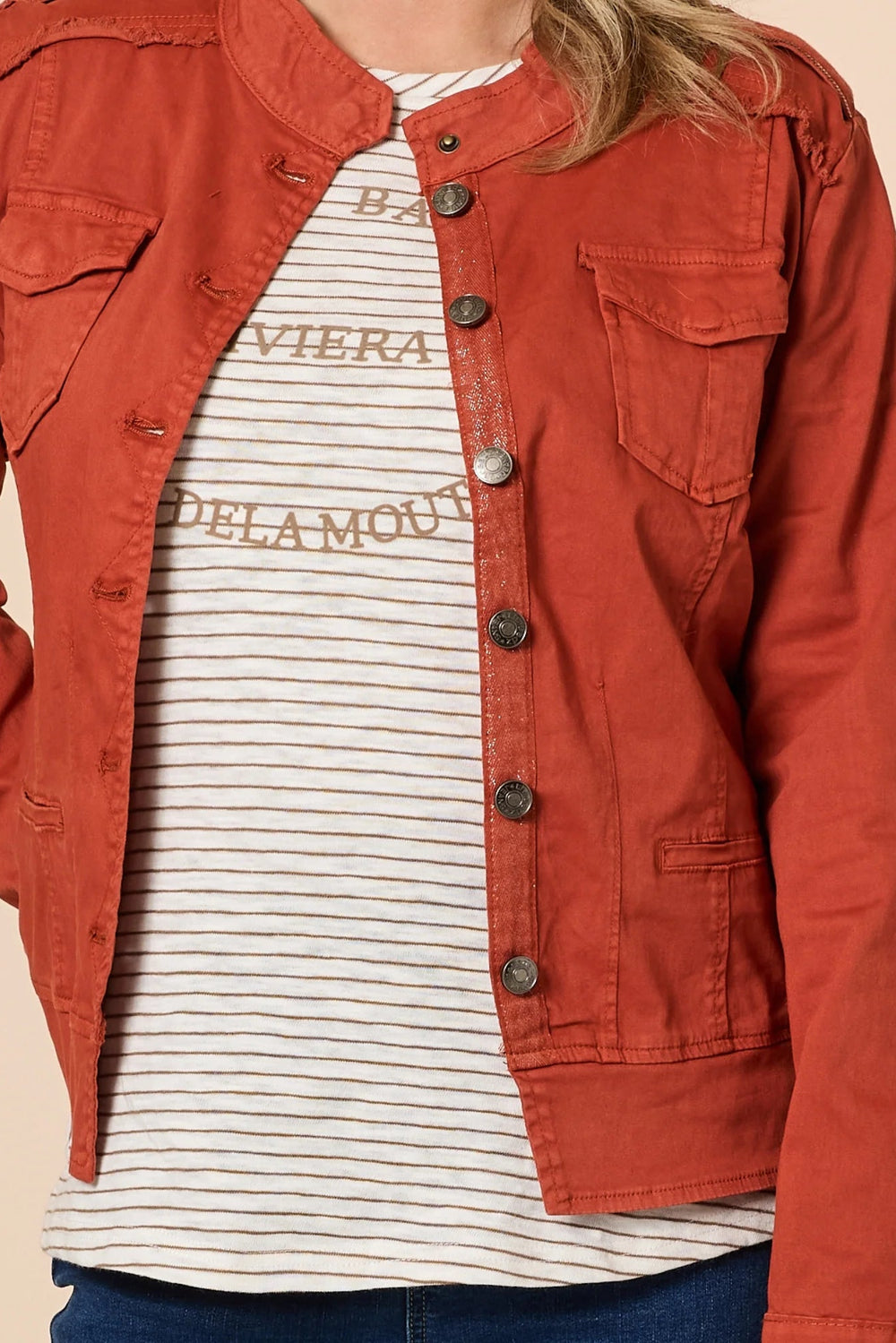 - This military-style jacket brings a fresh, feminine twist to a classic utility look.