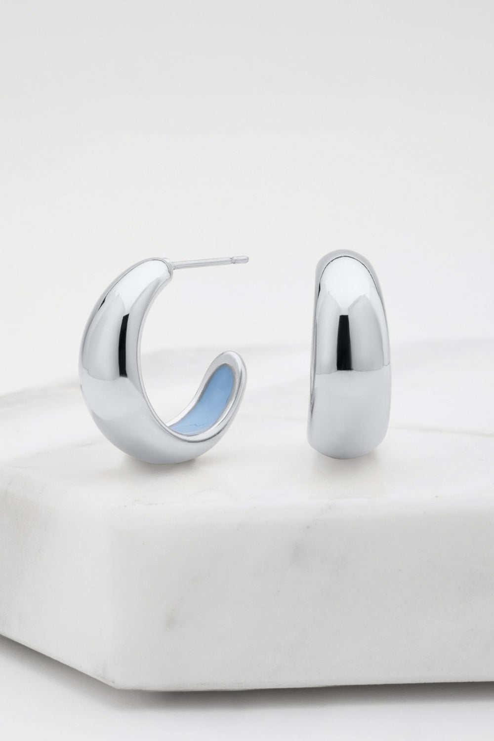 The Mindi Hoop in silver with blue enamel is sleek and vibrant, the perfect modern everyday hoop.