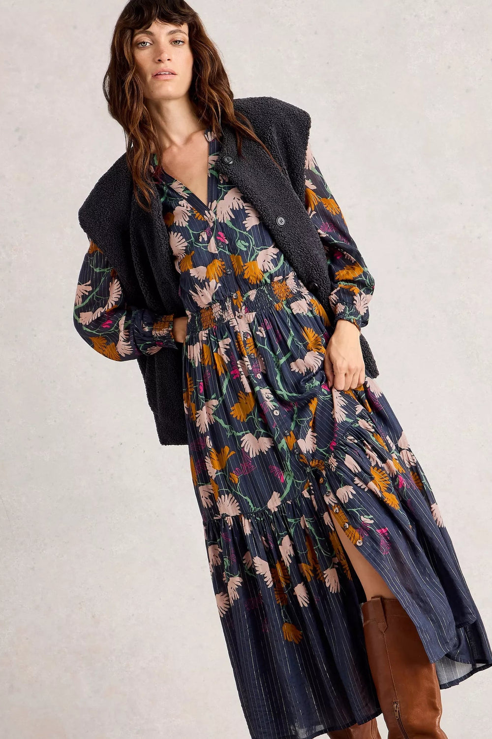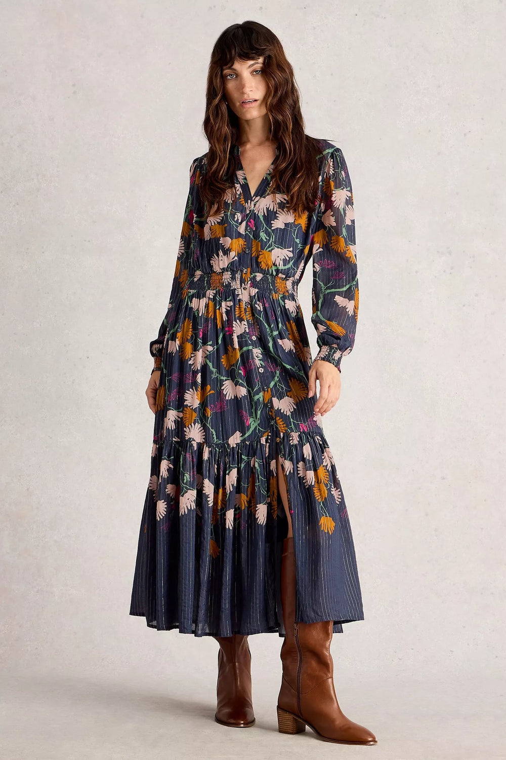 A notch neck. Long sleeves. A tie-up waist. Details we'll never get bored of. But what's this? Metallic glints catching our eye? We'll have to add that one to our list.